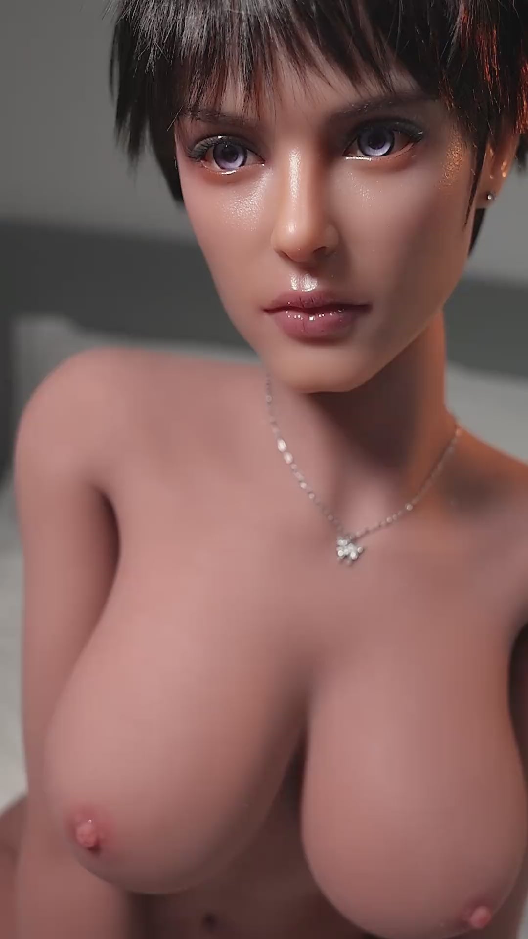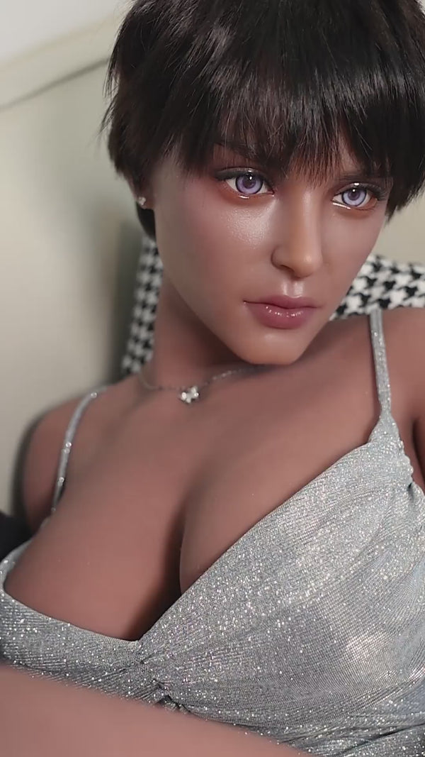 1. Stephine is different from other sex dolls. You will feel that she is special. She has wheat-colored skin, big boobs, bright light purple eyes, fleshy lips, pretty face, black short hair and perfect body.